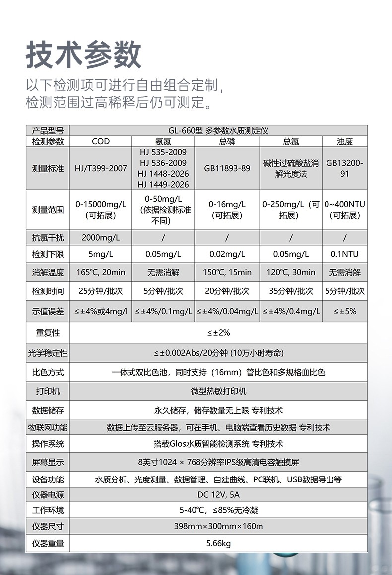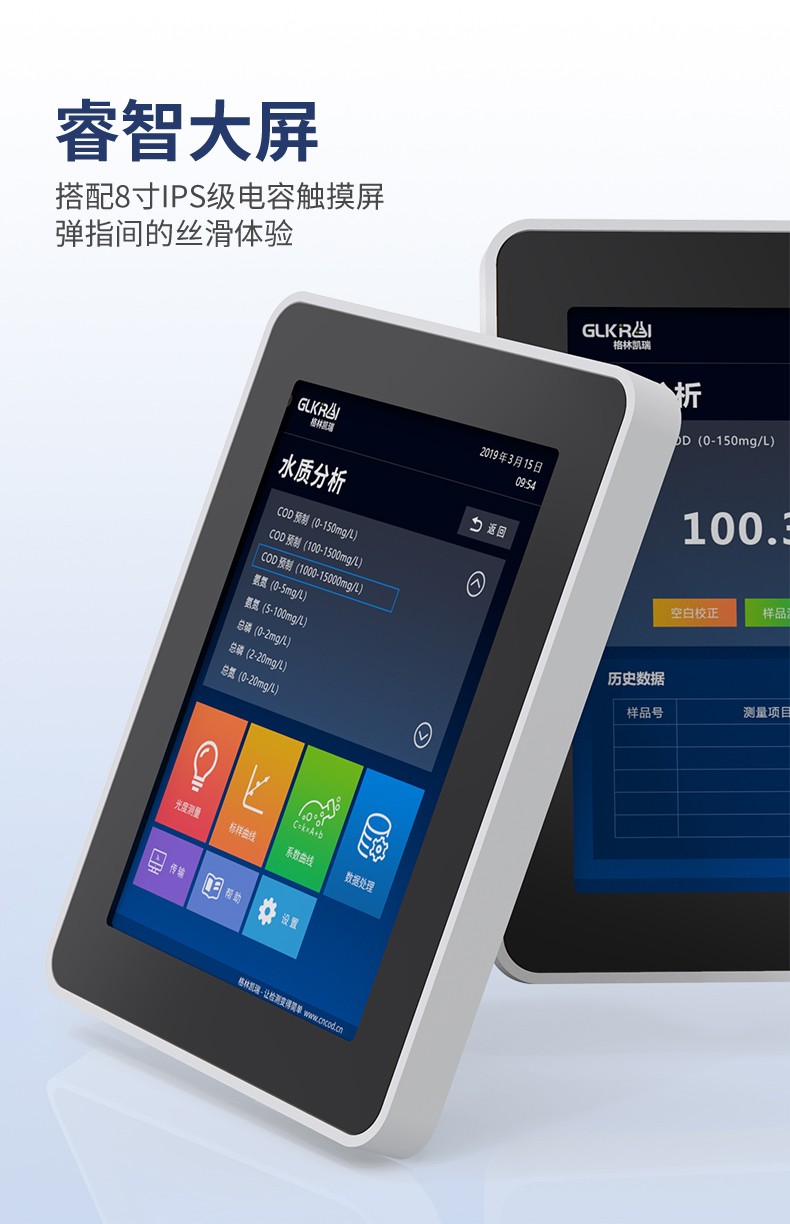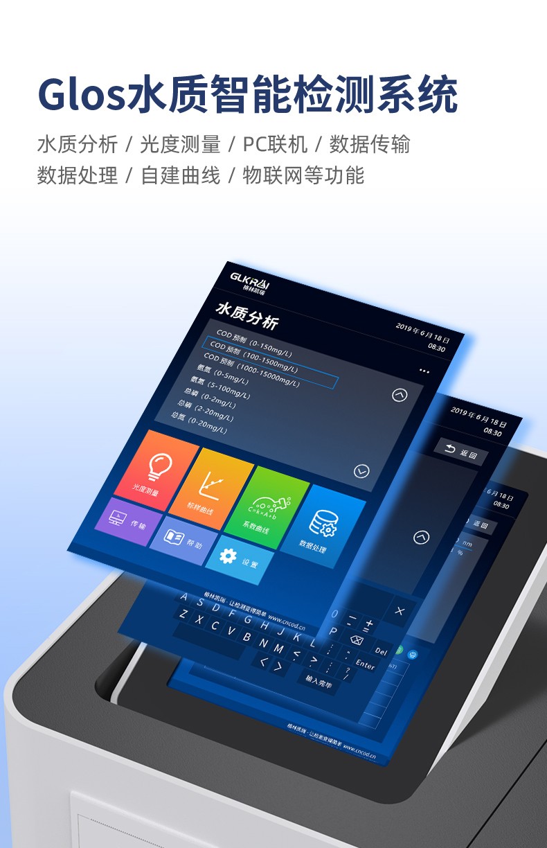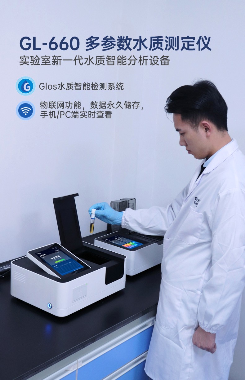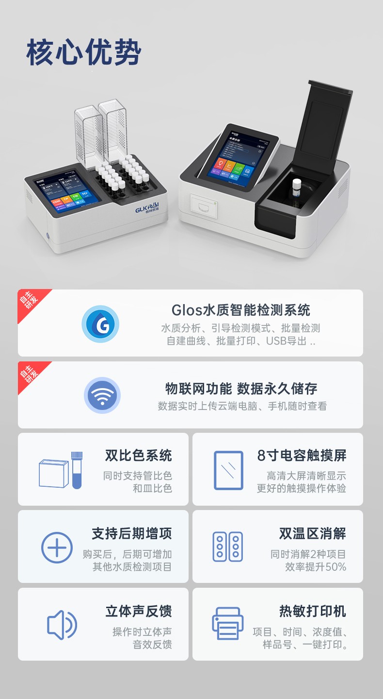 测定项目的原理符合环保行业认可方法,设备的光源、传感器为国外进口,拥有更稳定的光学性能,设备搭载自主研发的Glos水质智能检测系统和一体式双比色池技术,使检测变得更简单,更稳定。
